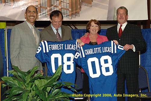 Coach Dungy (left) and Jim Irsay present Charlotte and Forrest with Colt jerseys.