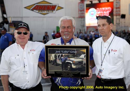 GM Racing's Fred Simmonds and Dan Engel presented "Lefty" with a plaque