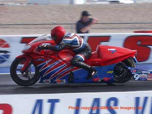 Mike Berry came down from Denver to test his Pro Stock Suzuki. His 7.229 on Saturday would have made him #1 qualifier at last October's AC Delco Nationals at LVMS.