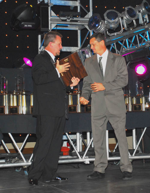 Mike Baker presents Chris Gulitti with Most Improved Sportsman Driver of 2007 award.