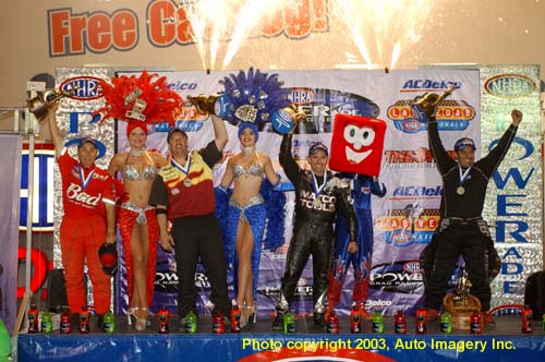 Kenny Bernstein, Greg Anderson, Craig Treble and Tony Pedregon celebrate their wins at the AC Delco Nationals.