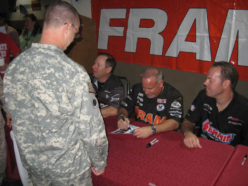The drivers met and signed autographs for over 300 soldiers and sailors at the Camp Arifjan Rec Center.