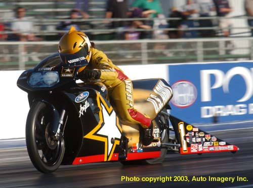 Angelle Savoie jumped to the top of the Pro Stock Bike field with a 7.164 at 185.28 mph.