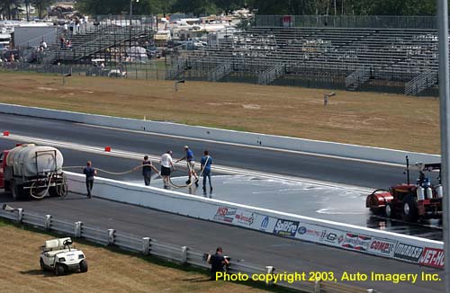 Because of oils still present in asphalt that hasn't completely cured, NHRA officials decided to end Thursday's activities early and scrub the most affected portions of the track.