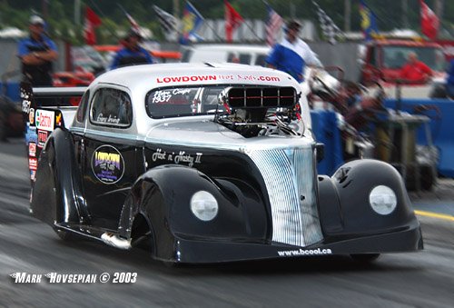 Epping, NH The world's quickest and fastest '37 Chevy Coupe is this 526 cubic inch nitro snorting beauty of Gary Irving. The car runs 6.20s at 226+ in the Super Chevy Show Nitro Coupe circuit.