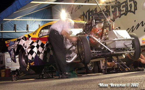 Epping, NH Jim Nordhougen and crew burn the midnight oil, prepping his wild Nitro Coupe after Saturday's qualifying during the Super Chevy Show event at New England Dragway.