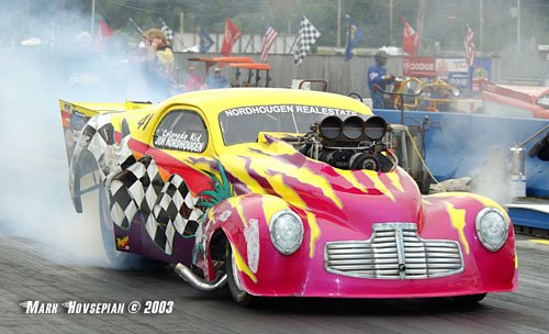 Epping, NH This colorful '41 Chevy Coupe is Jim Norhougen's Nitro Coupe. Look's like he's picked a few ouchies along the way in the national touring, 20-event Super Chevy Show Nitro Coupe Series.
