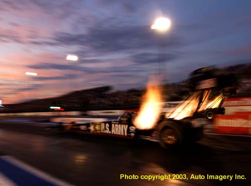 Tony Schumacher blasts off into the sunset on a Friday evening qualifying pass.
