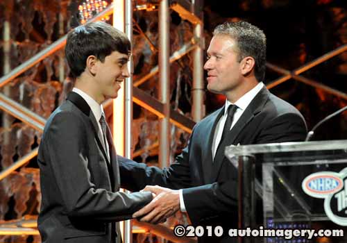 Fellow nominee Shane Gray congratulates LE Tonglet for winning the Road to the Future Award.