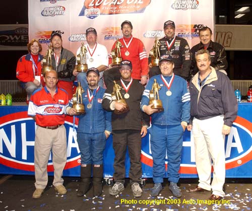 the podium. In the front row (from L to R) are NHRA's Charlie Nielsen,