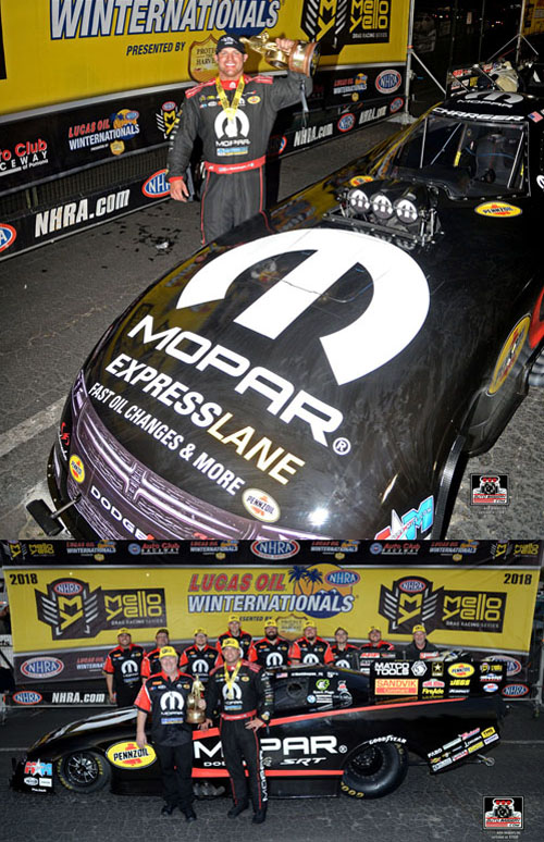 Matt Hagan celebrates his third Winternationals win and 27th Funny Car Wally.
