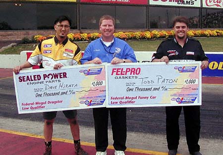 Dave Hirata and Todd Paton picked up the low qualifier money posted by Federal Mogul in Federal Mogul Dragster and Federal Mogul Funny Car.