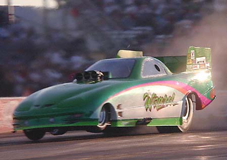 Ronny Young and the "Wizard" Funny Car struggled to a best of 5.31 this weekend and endured an ugly top end fire in the final qualifying session.
