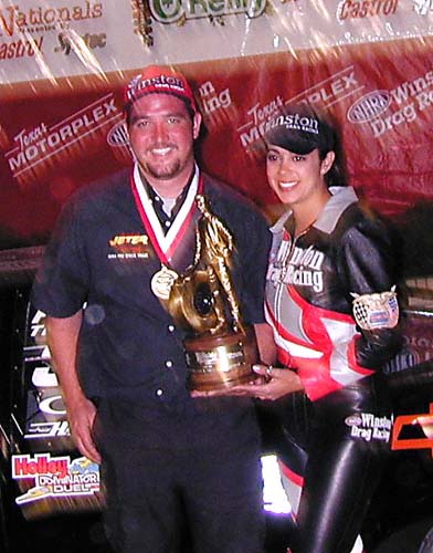 Miss Winston, Jackie Becke, presents the O'Reilly Fall Nationals Pro Stock Truck trophy to Brad Jeter.