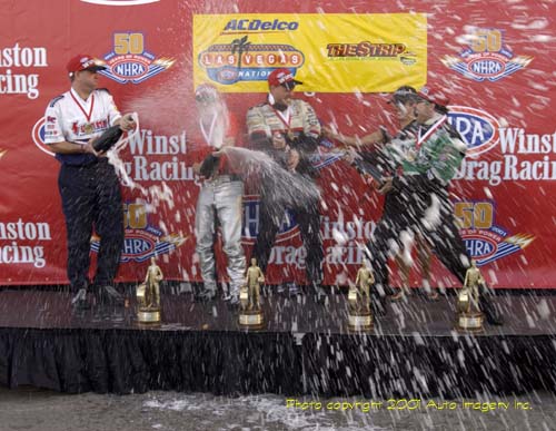 The Pro winners (from L to R) Mark Pawuk, Shawn Gann, Darrell Russell and Ron Capps waste perfectly good champagne.