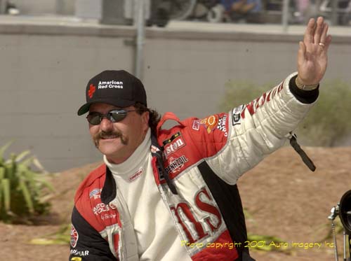 Gary Scelzi waves to the crowd after his first Saturday qualifying pass.