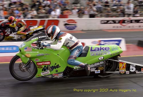 Geno Scali qualified 9th aboard Pete Briggs' Kawasaki and defeated Tom Miceli in the first round, but redlighted against Angelle Savoie in round two.