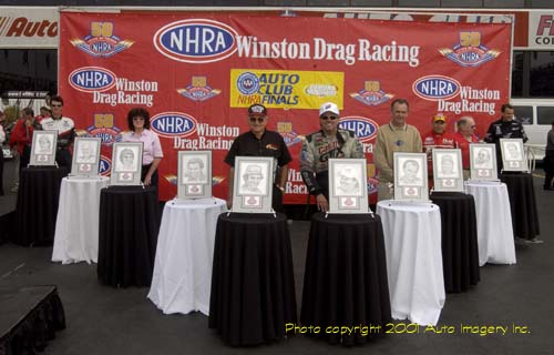 (missing are Warren Johnson and Don Prudhomme) pose with portraits drawn for