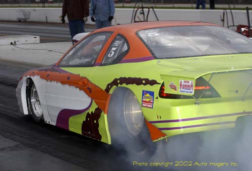 Jerry Yeoman heats the tires on his mountain motor Pro Stock Grand Am.