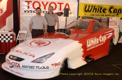 Gary Scelzi and Alan Johnson pose with their new Toyota Celica at the official unveiling Wednesday. The body is unlike anything seen before with a number of aerodynamic innovations.