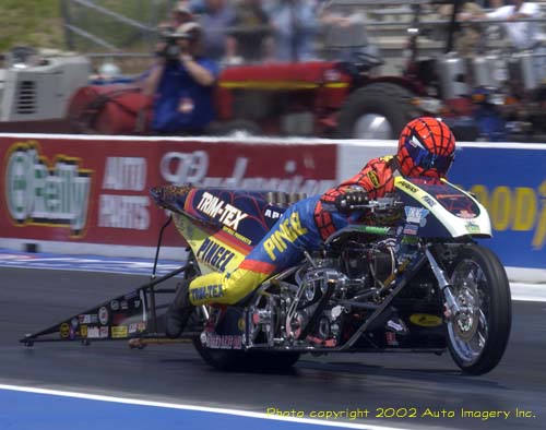 The Top Fuel Bikes made their first NHRA appearance of the 2002 season and Larry McBride was the quickest and fastest with a 6.05 at 220 mph run in their final session on Sunday.