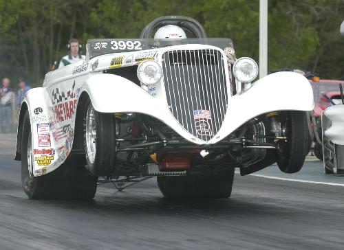 John Vineyard launched hard with the front wheels in the air in his Super Rod roadster.