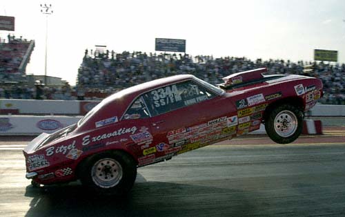 Ernie Price may have redlighted in the Super Stock final, but he was certainly the crowd favorite doing wheelstands such as this one the last couple of rounds.