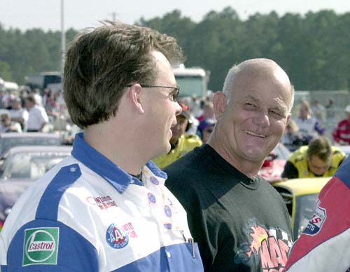 The newest members of John Force's team, Jimmy Prock and Gary Densham enjoy a laugh in the staging lanes during Friday qualifying.