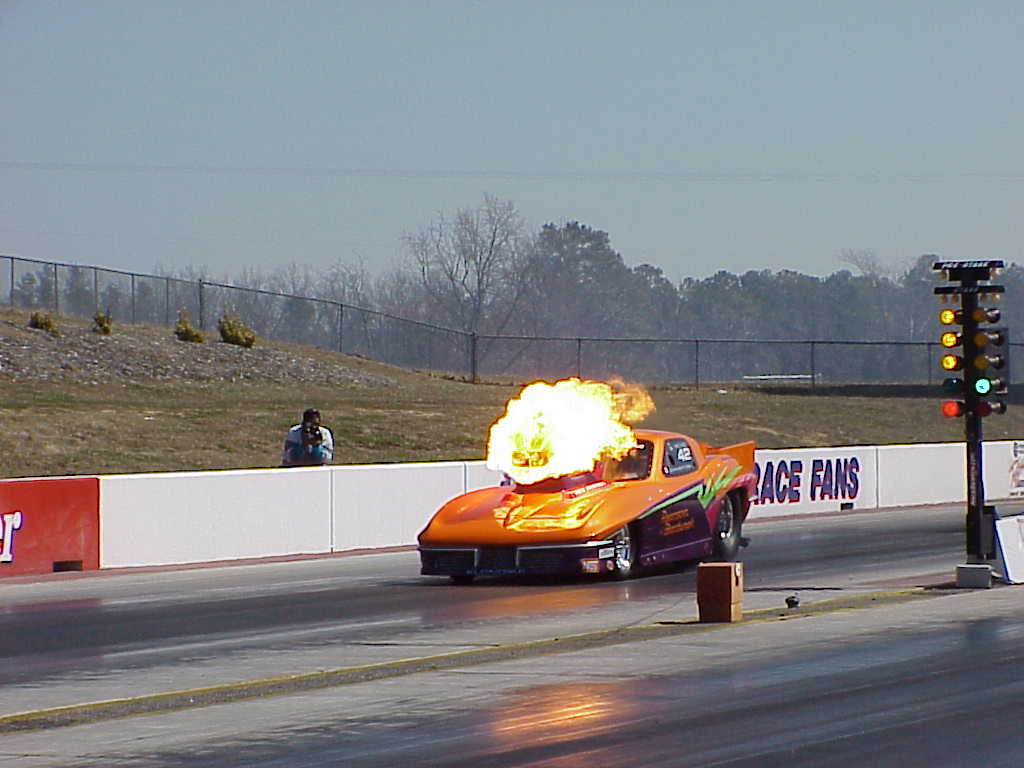 John Bartunek's '63 Corvette coughed up a big fireball on his first qualifying run Saturday at the CompetitionPlus.com IHRA Spring Open.