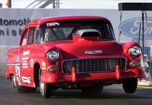 Robert Pancer's '55 Chevy starts to wad up the tire on a late afternoon Super Gas time trial.