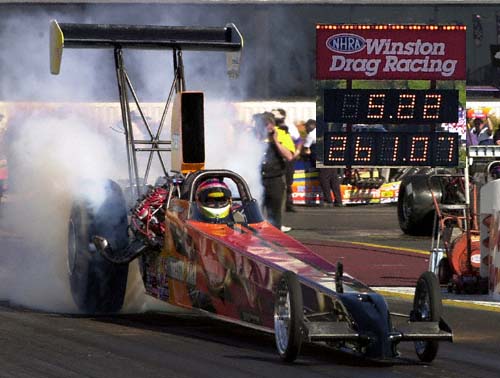 David Baca set the Federal Mogul Dragster world on it's ear with a 5.28 elapsed time the AAA Finals. This weekend he flattened them with a 5.22 thrashing of Brian Hough in the 2nd round.
