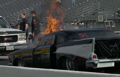 This unidentified Pro Mod '57 Chevy backfired on the starting line and suffered moderate damage before the track safety crew was able to extinguish the fire.