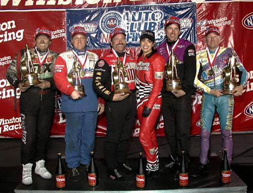 John Force, Kurt Johnson, Gary Scelzi, Greg Stanfield and Tony Mullen joined Miss Winston, Jackie Becke, on the victory podium.
