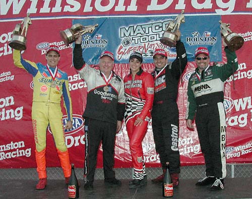Pro winners Dave Schultz, Warren Johnson, John Force and Cory McClenathan are joined by Miss Winston, Jackie Becke on the victory podium.