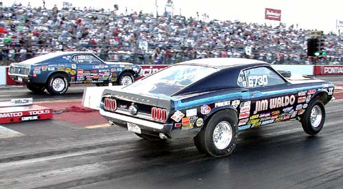 Jim Waldo (near lane) earned the Stock title at the Matco Tools Super Nationals by defeating fellow Cobra Jet racer Bill Howell in the final.