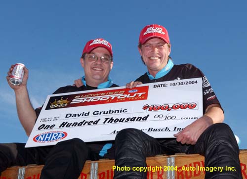 Crew Chief Jon Oberhofer (left) and driver Dave Grubnic celebrate their $100,000 victory in the Bud Shootout.
