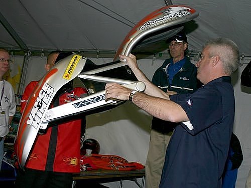 Rob Geiger and Bob Frey check out the damaged Harley-Davidson V-Rod body that got Andrew Hines to