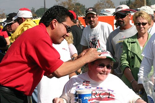 Cruz Pedregon adds his autograph to a young fan's John Force Castrol GTX hat prior to Sunday's eliminations.