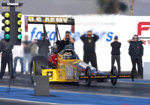 Tony Schumacher launches the U.S. Army Top Fuel Dragster enroute to the quickest elapsed time of